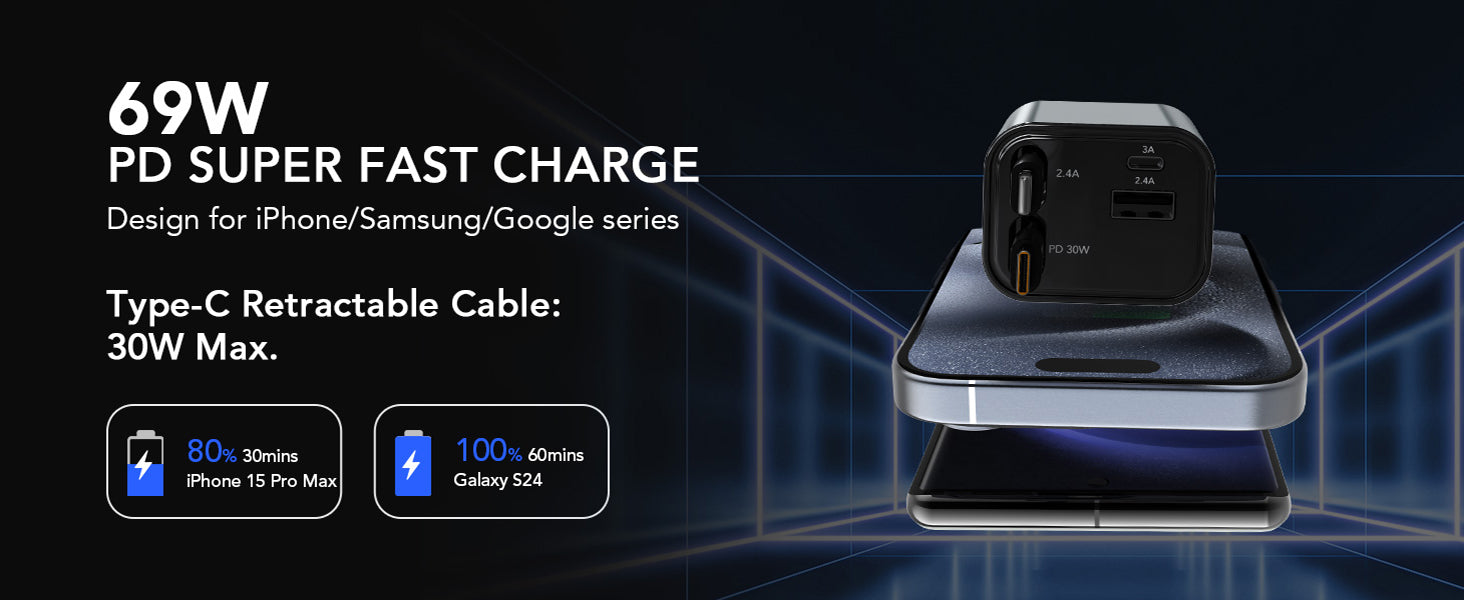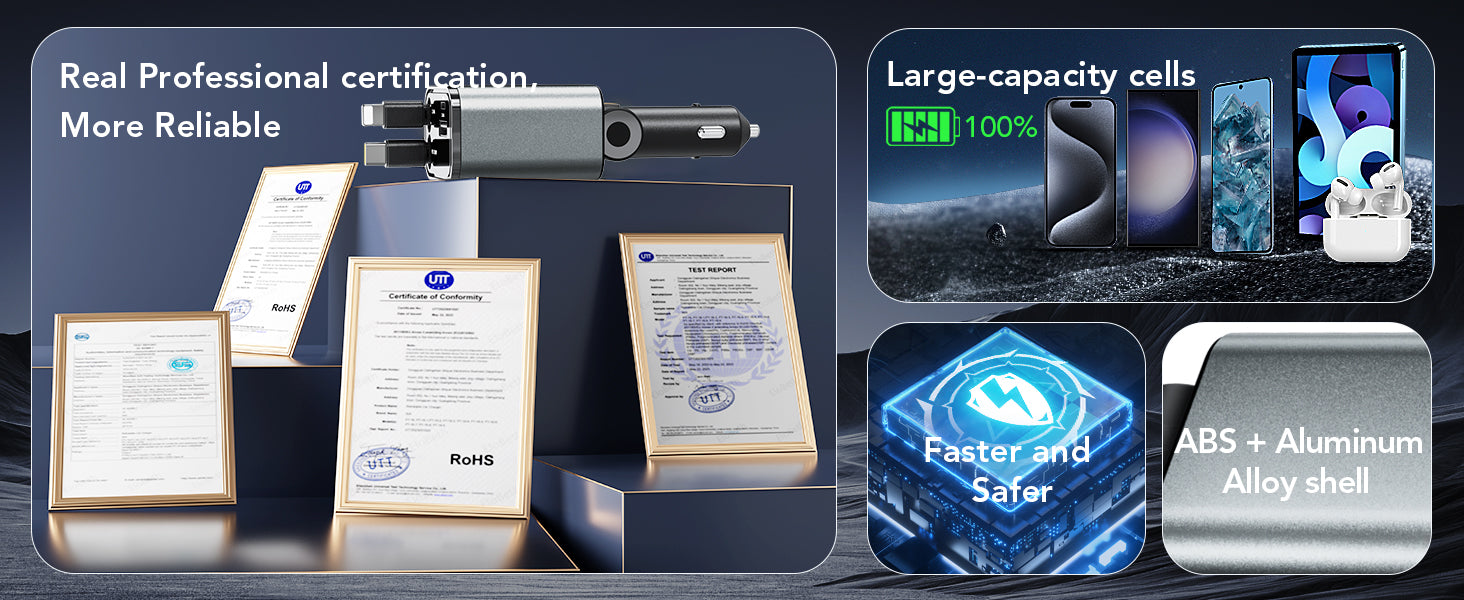 4-in-1 Retractable Car Charger 66W – Dual Lightning Cables